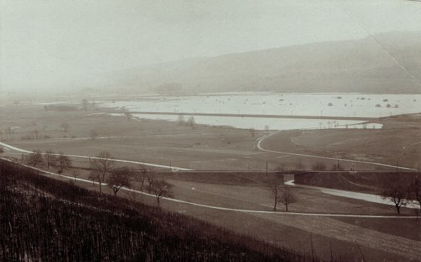Links die ein Jahr zuvor gebaute Fabrikanten-Villa Güller, rechts das Restaurant Bahnhof.
