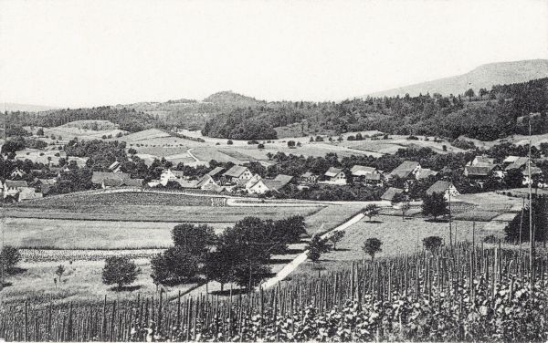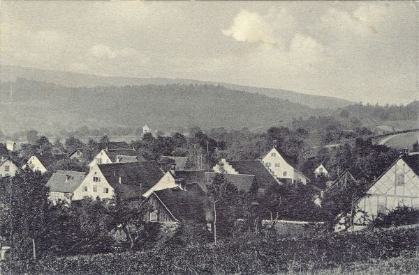 Linke Hälfte der nun hergestellten Doppelkarte (Kommentar siehe unter „Dorfansicht | 1911 | linke Hälfte“) als Einzelkarte. Weisungsgemäss hatte die Druckerei die gewünschten „schönen Wolken“ eingesetzt, die Farbe „crayon“ verwendet, oben links mit „Otelfingen“ beschriftet und neben den Panoramaansichtskarten auch Einzelkarten der linken und rechten Hälfte gedruckt.