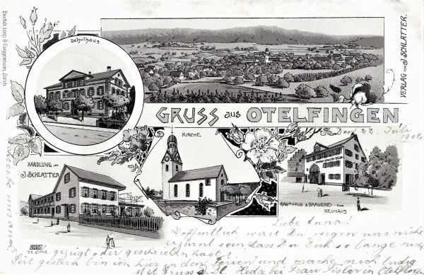 Sie zeigt eine Gesamtansicht des Dorfes von Süden Richtung Lägern (damals Lägernberg genannt). Verschickt wurde sie von Otelfingen nach Laufen ZH und ist rückseitig datiert vom 31.10.1907. Der wenige, freie Platz auf der Bildseite ist eng beschrieben, denn die Adressseite durfte damals nicht für Text verwendet werden. Und wurde hier trotzdem benutzt…