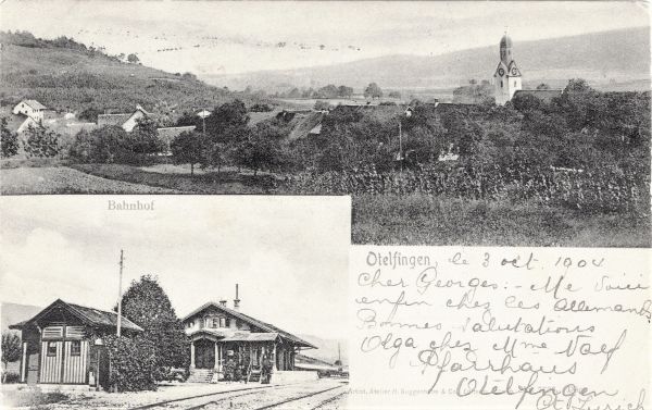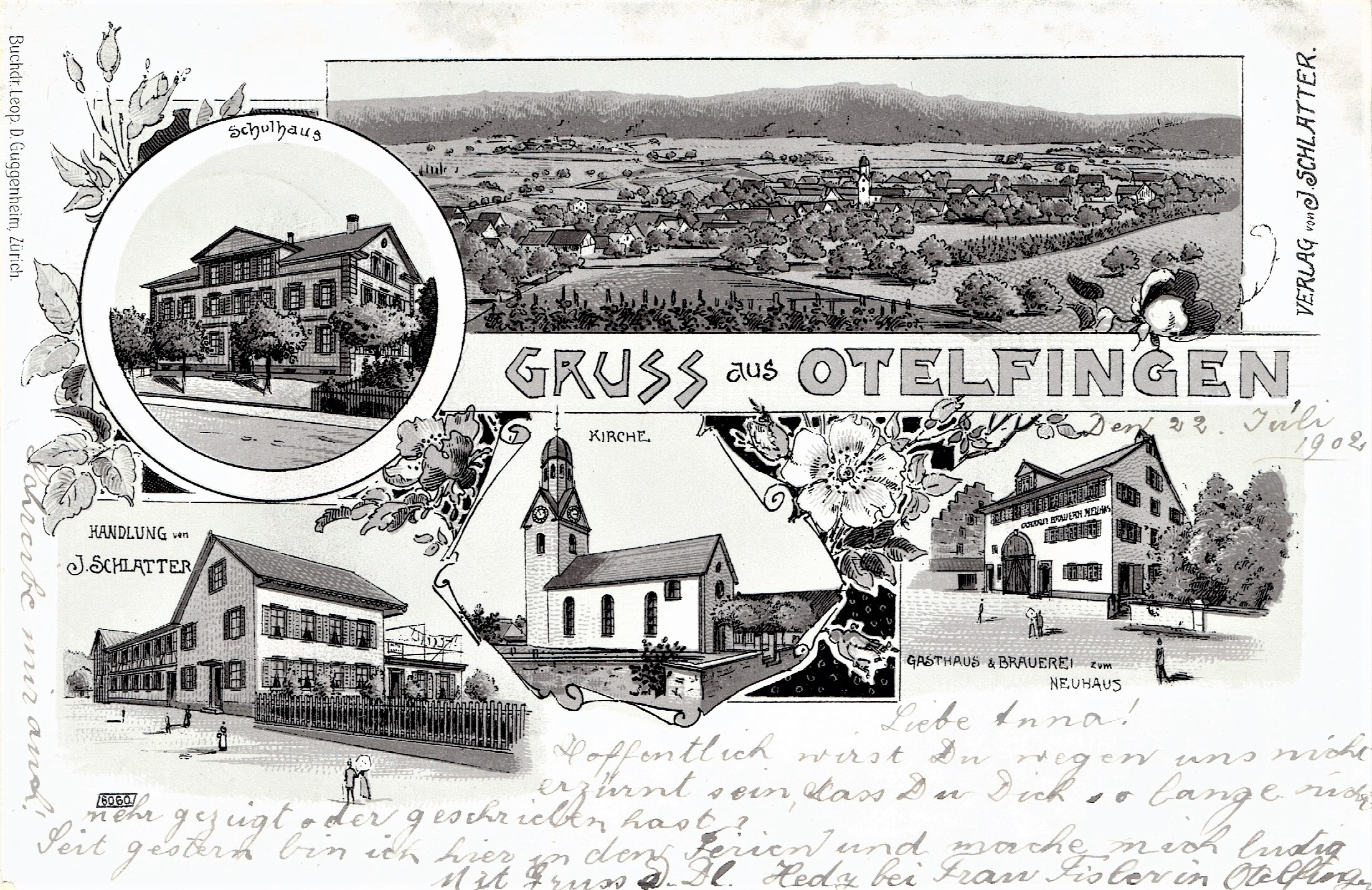 Einfache, selbstgemachte Ansichtskarte „Gruss aus Otelfingen“ mit 3 Bildern und Verzierungen, alles von Hand gezeichnet und (fehlerhaft) beschriftet. Datiert vom 15.2.1903 und nach Bülach ZH verschickt. Oben in der Mitte ist noch das damals verwendete, in dieser Version jedoch etwas freihändig dargestellte Gemeindewappen mit dem Ährenbündel zu sehen, wie es zwischen 1836 und 1928 in Gebrauch war. Es wurde nachher durch das bereits im Mittelalter gebräuchliche, heute bekannte Zeichen mit dem silbernen Eberkopf auf schwarzem Grund abgelöst.