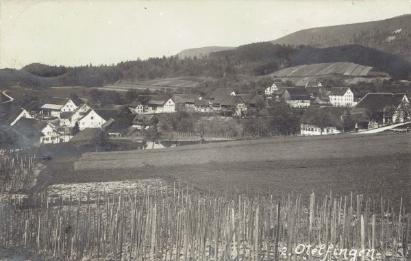 Sujet Nr. 1 einer 6er-Serie. Feldpoststempel Bat. 69. Datiert vom 2.8.1914 und nach Ecoteaux VD versandt.