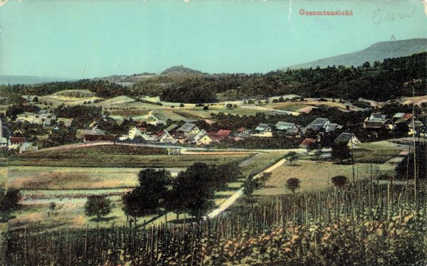 Linke Hälfte einer Panorama-Doppelkarte, handkoloriert. Die gleiche Ansichtskarte im Gross-/Querformat gab die LKO bereits 1911 heraus, damals jedoch als Schwarzweiss-Aufnahme.