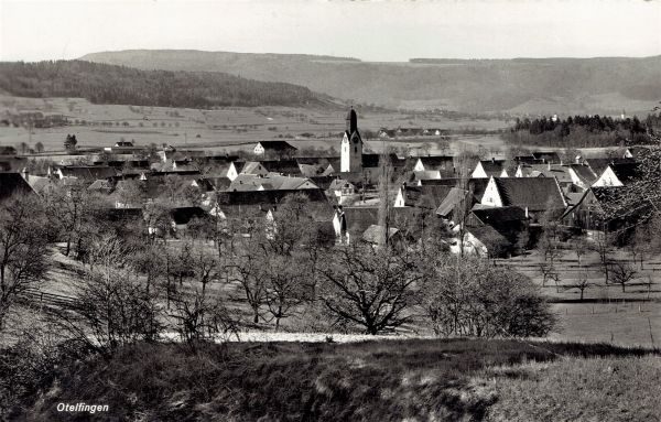 Dorfansicht mit Weitwinkel, oben in der Bildmitte Liegenschaft Im Oel, Dänikon und Schulhaus Rotflue, Dänikon-Hüttikon. Datiert 20.2.1954 und versandt nach Affoltern a/A ZH