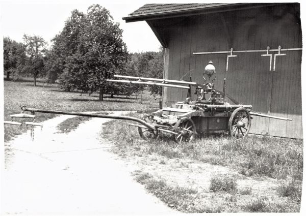 Plakette an handbetriebener Feuerspritze von 1838. Der Erbauer Johannes Gross führte hinter der Landstrasse 19 eine mechanische Werkstätte und war von 1847-1851 Gemeindepräsident von Otelfingen.