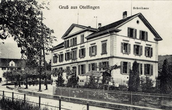 Hinten links ist auf dem Schulhausareal noch die Transformatorenstation der EGO Elektrizitätsgenossenschaft Otelfingen mit ihrem „Glögglibaum“ zu erkennen. Von dieser Stelle aus versorgte man in der Anfangszeit der Elektrifizierung die Gebäude im Dorf mit Stromleitungen. Um 1914 wurde dieser Verteilermast abgebrochen.