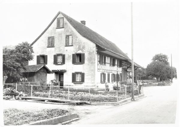 Restaurant Höfli und Bäckerei Haag. Vor dem Haus stehen immer noch der Brunnen und die Tanksäule.