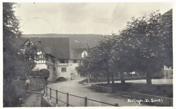 Gasthaus zum Höfli mit Bäckerei. Vor dem Haus befinden sich Tanksäule und Brunnen. Beschriftung rechts unten: Tel 5. Damit gehörte das Gasthaus zu den ersten Besitzern im Dorf mit einem Telefonanschluss. Datiert vom 6.6.1932 und mit Militärpost nach Zürich verschickt.