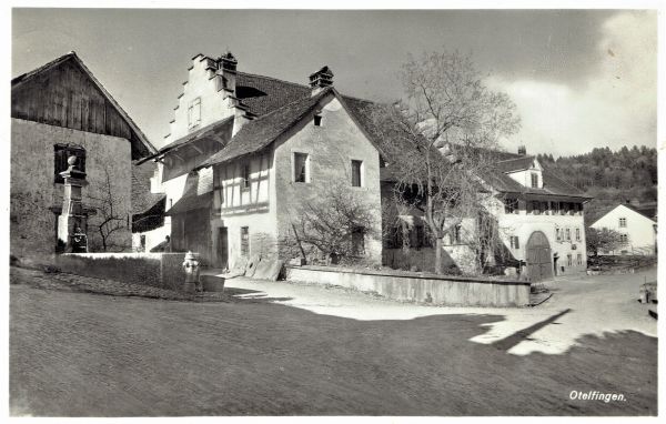 Gasthaus zum Höfli rechts und Bäckerei Haag links. Der alte Hausbrunnen und eine Tankstelle stehen immer noch vor dem Haus.