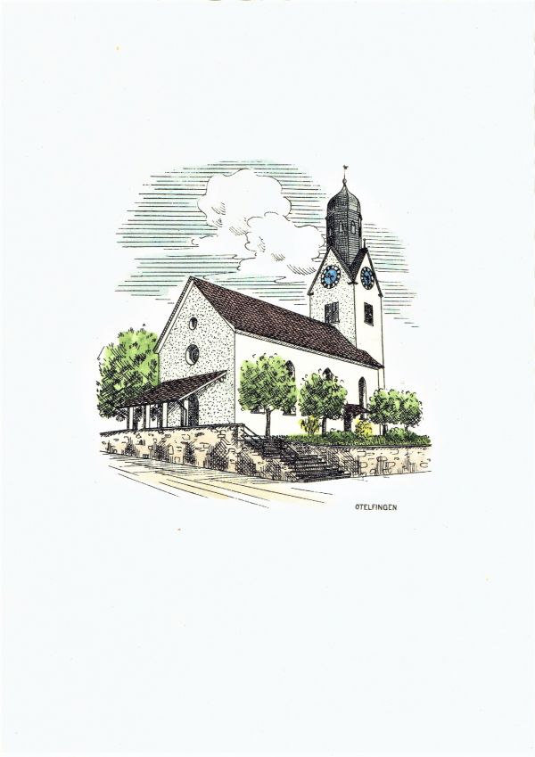 Auf der Zeichnung ist der 1958 gebaute, überdeckte Kircheneingang zu sehen mit zwei Zugangstreppen links und rechts. Vorher erfolgte der ungedeckte Zugang über eine Treppe direkt von der Hinterdorfstrasse her.